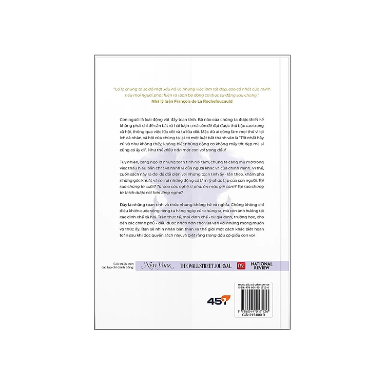 Đây là những toan tính vô thức nhưng không hề vô nghĩa. Chúng không chỉ điều khiển cuộc sống riêng tư hàng ngày cảu chúng ta, mà còn ảnh hưởng tới các định chế xã hội. Trên thực tế, mọi định chế – từ gia đình, trường học, cho đến các chính phủ – đều được nhào nặn cho vừa vặn với những mong muốn vô thức ấy. Bạn sẽ nhìn nhận bản thân và thế giới một cách khác biệt hoàn toàn sau khi đọc quyển sách này, và biết rằng trong đầu có giấu con voi.