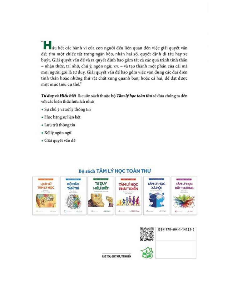 (Đã bao gồm VAT)Tư duy và hiểu biết thuộc bộ Tâm lý học toàn thư, được viết và kiểm định bởi các chuyên gia tâm lý học, các nhà trị liệu tâm lý, nhà thần kinh học và các học giả. Sách gồm nhiều hình ảnh, sự kiện, thí nghiệm và phương pháp nghiên cứu khoa học, qua đó diễn giải cách bộ não chúng ta tiếp nhận, xử lý thông tin và giúp cơ thể tạo ra những phản ứng thích hợp, từ đó chúng ta có thể học tập, ghi nhớ, giao tiếp và sáng tạo. Sách cũng cung cấp tiểu sử và các lý thuyết tiêu biểu trong ngành tâm lý học, từ đó giúp độc giả hiểu thêm về lĩnh vực khoa học nghiên cứu chính bộ não và tâm trí mình.