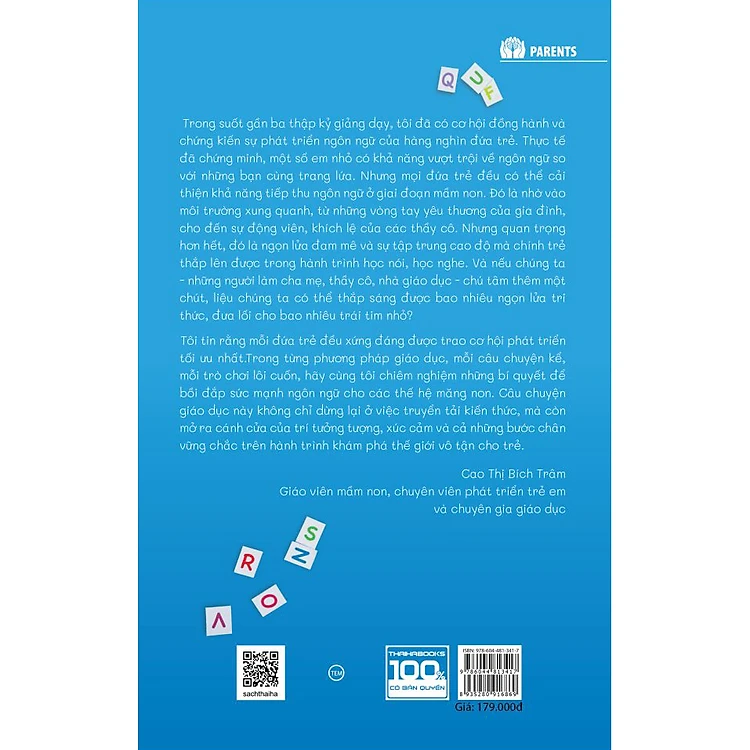 Cuốn sách là một hướng dẫn toàn diện về phát triển ngôn ngữ cho trẻ từ 0 đến 6 tuổi dành cho cha mẹ, giáo viên và người chăm sóc trẻ, được xây dựng bởi cô Cao Thị Bích Trâm – giáo viên mầm non, chuyên gia giáo dục và chuyên viên phát triển trẻ em.